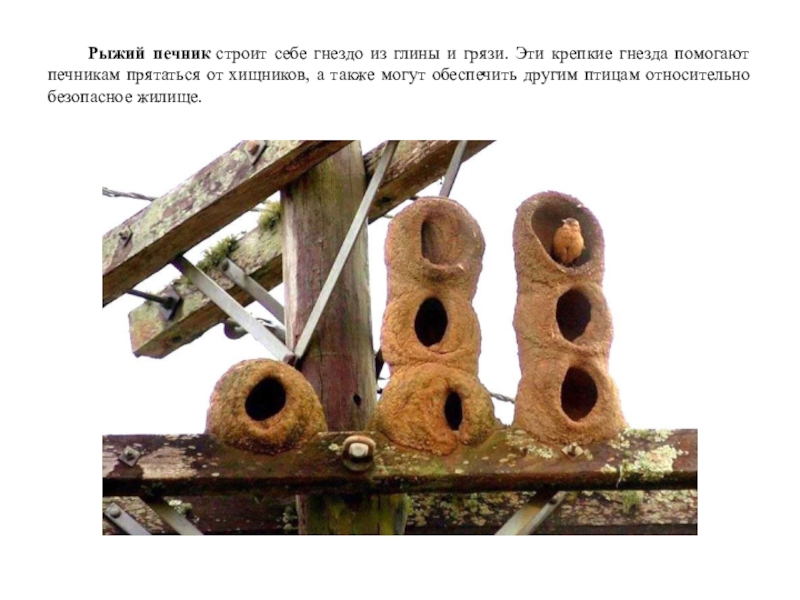 Слайд 15 Рыжий печник строит себе гнездо из глины и грязи.