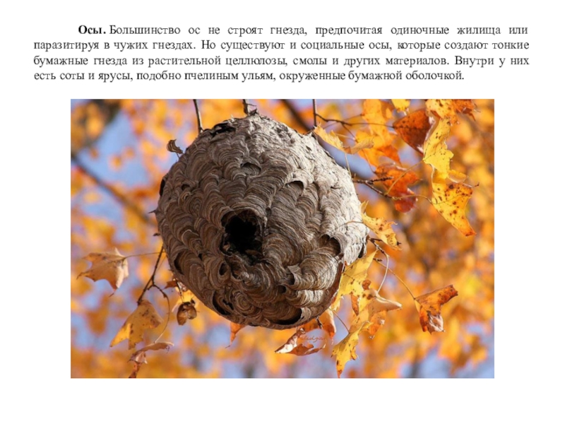 Слайд 21 Осы. Большинство ос не строят гнезда, предпочитая одиночные жилища