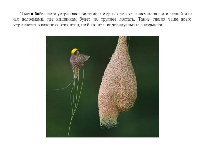 Слайд 17 Ткачи байя часто устраивают висячие гнезда в зарослях колючих