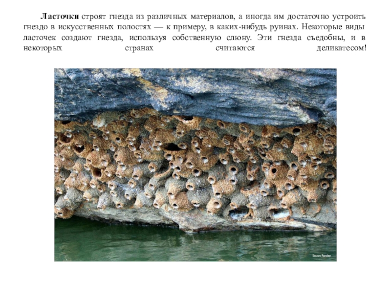 достаточно устроить гнездо в искусственных полостях — к примеру, в каких-нибудь руинах. Некоторые виды ласточек создают гнезда, используя собственную слюну. Эти гнезда съедобны, и в некоторых странах считаются деликатесом!