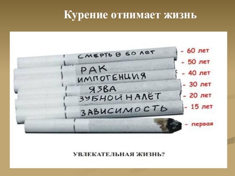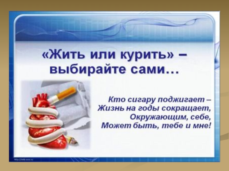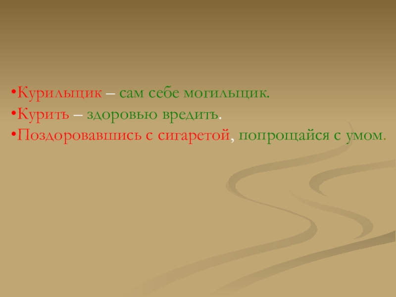 Курильщик – сам себе могильщик.Курить – здоровью вредить.Поздоровавшись с сигаретой, попрощайся с умом.