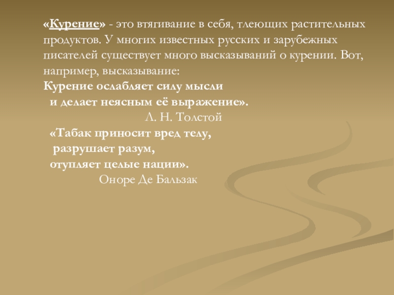 «Курение» - это втягивание в себя, тлеющих растительных продуктов. У многих известных русских и зарубежных писателей существует много высказываний о курении. Вот, например, высказывание:Курение ослабляет силу мысли и делает неясным её выражение».