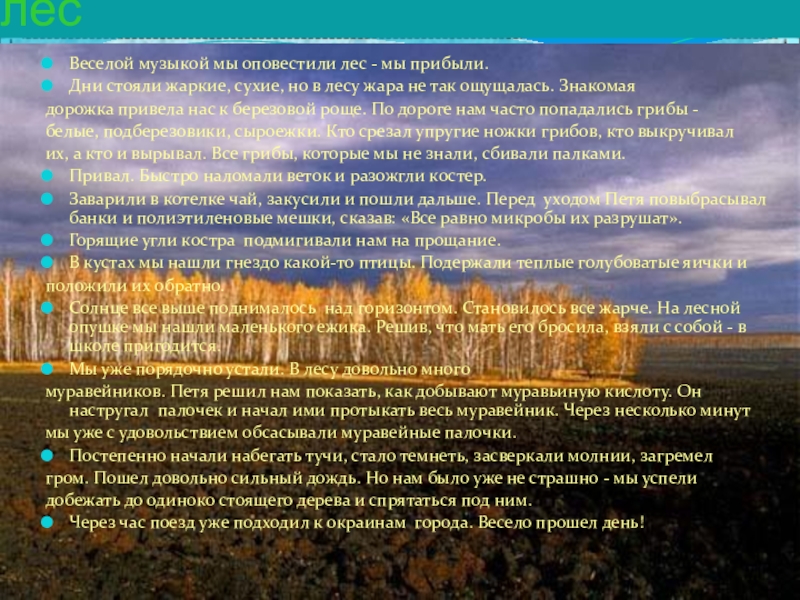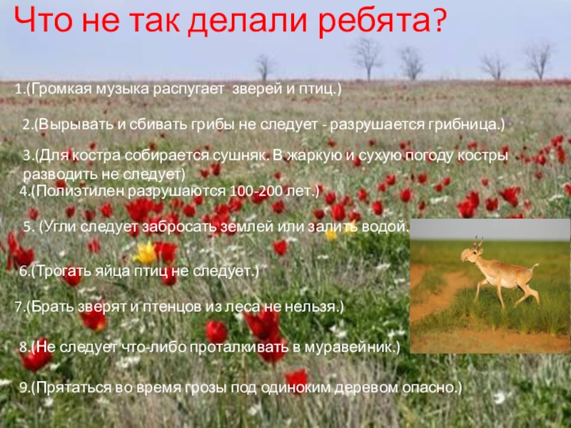 одноклассниками ходил в лес. Сейчас вы послушаете рассказ о том, как они вели себя в лесу, и отметите те нарушения и ошибки, которые школьники, по вашему мнению,