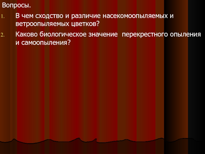 связь опыления и оплодотворения. Выявить различия в строении цветка ветроопыляемых и насекомоопыляемых растений, доказать, что опыление насекомыми является более прогрессивным, чем опыление ветром.