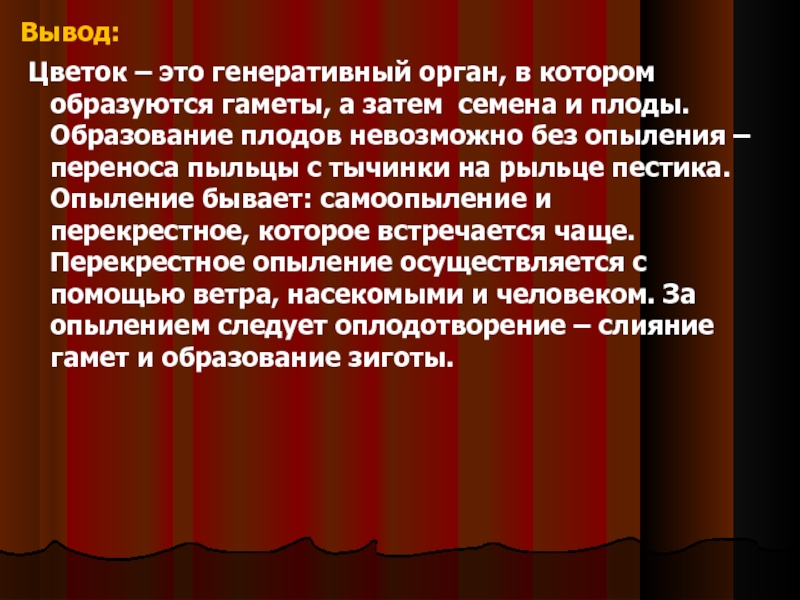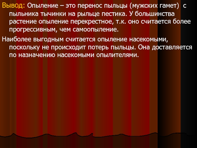 Слайд 11Вывод: Опыление – это перенос пыльцы (мужских гамет) с пыльника тычинки