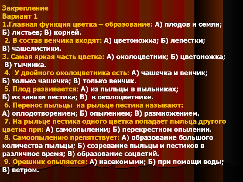1.Главная функция цветка – образование: А) плодов и семян;