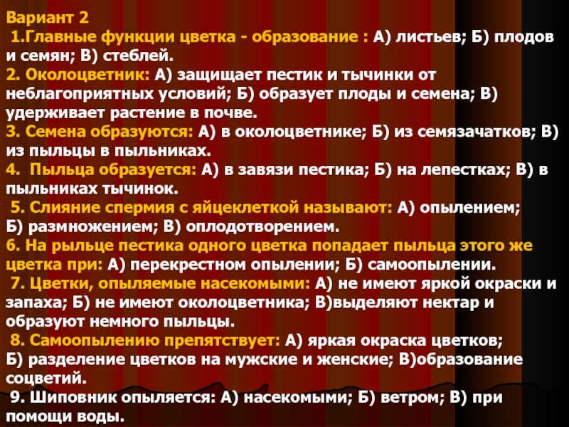 2. Околоцветник: А) защищает пестик и тычинки от неблагоприятных условий; Б) образует плоды и семена; В) удерживает растение в почве.