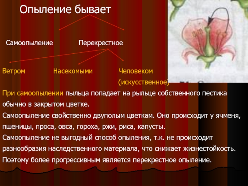 на рыльце пестика. У большинства растение опыление перекрестное, т.к. оно считается более прогрессивным, чем самоопыление.
