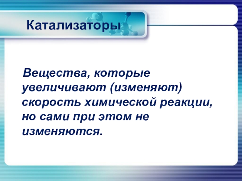 Катализаторы  Вещества, которые увеличивают (изменяют) скорость химической реакции, но сами при этом не изменяются.