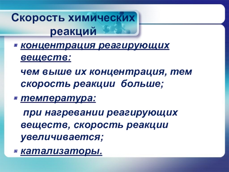 Скорость химических реакцийконцентрация реагирующих веществ:  чем выше их концентрация, тем скорость реакции больше;температура:  при нагревании