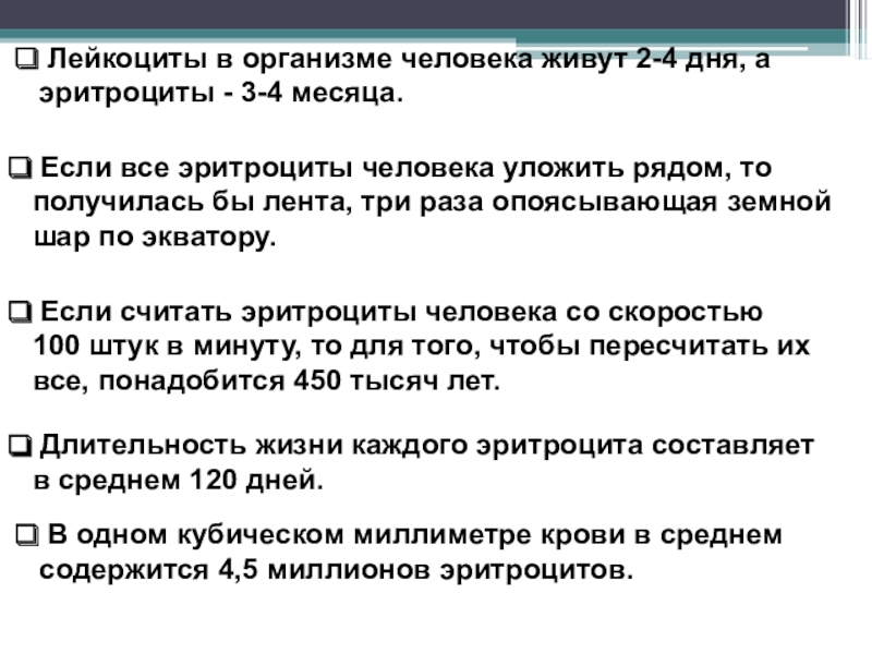 Если считать эритроциты человека со скоростью 100 штук в минуту, то для того, чтобы пересчитать их все, понадобится 450 тысяч лет.