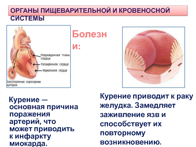 Курение приводит к раку желудка. Замедляет заживление язв и способствует их повторному возникновению.