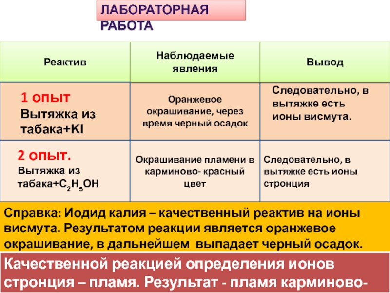 Справка: Иодид калия – качественный реактив на ионы висмута. Результатом реакции является оранжевое окрашивание, в дальнейшем выпадает черный осадок.