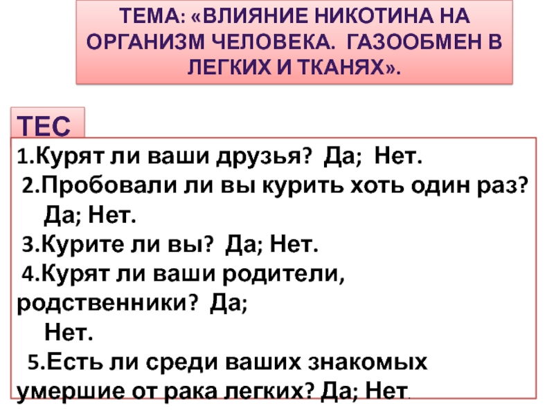 Тема: «Влияние никотина на организм человека. Газообмен в легких и тканях».