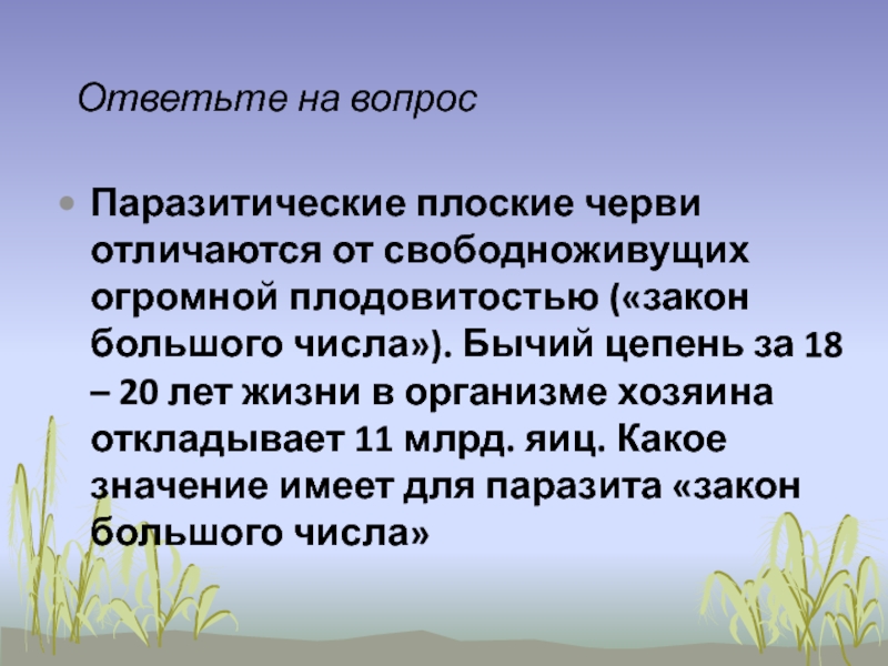 большого числа»). Бычий цепень за 18 – 20 лет жизни в организме хозяина откладывает 11 млрд. яиц. Какое значение имеет для паразита «закон большого числа»