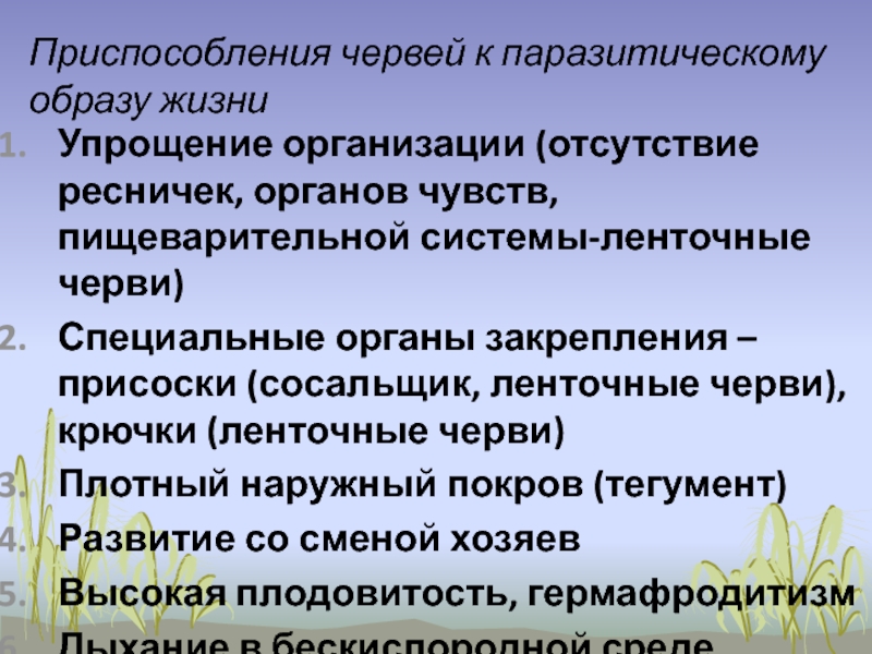 Слайд 13Приспособления червей к паразитическому образу жизни