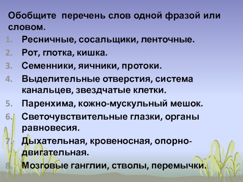 Слайд 16Обобщите перечень слов одной фразой или словом.