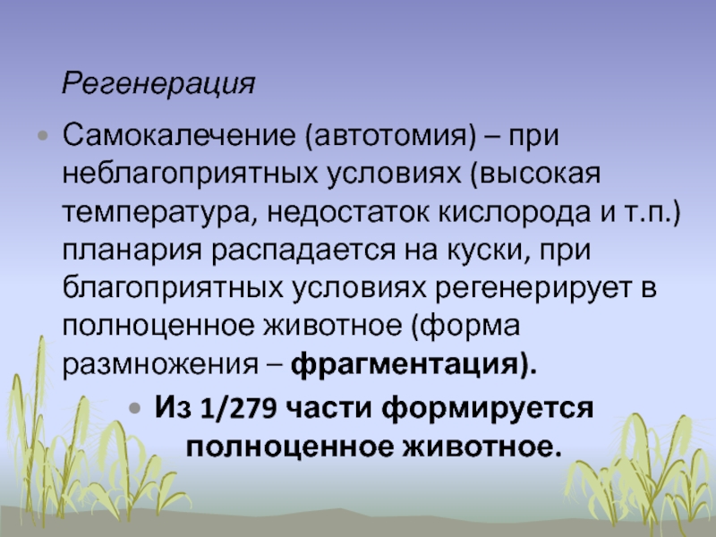 и т.п.) планария распадается на куски, при благоприятных условиях регенерирует в полноценное животное (форма размножения – фрагментация).
