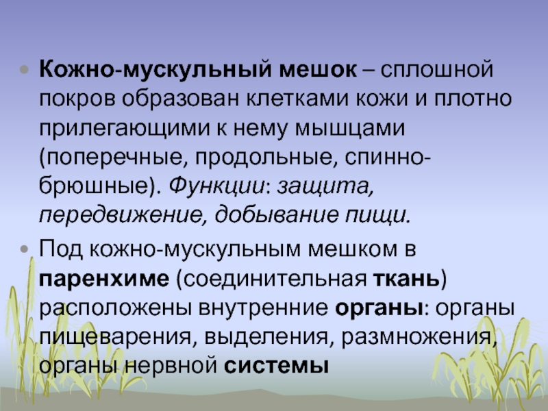Слайд 8Кожно-мускульный мешок – сплошной покров образован клетками кожи и плотно прилегающими