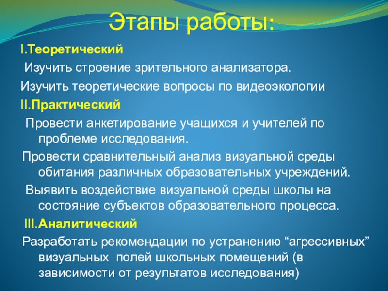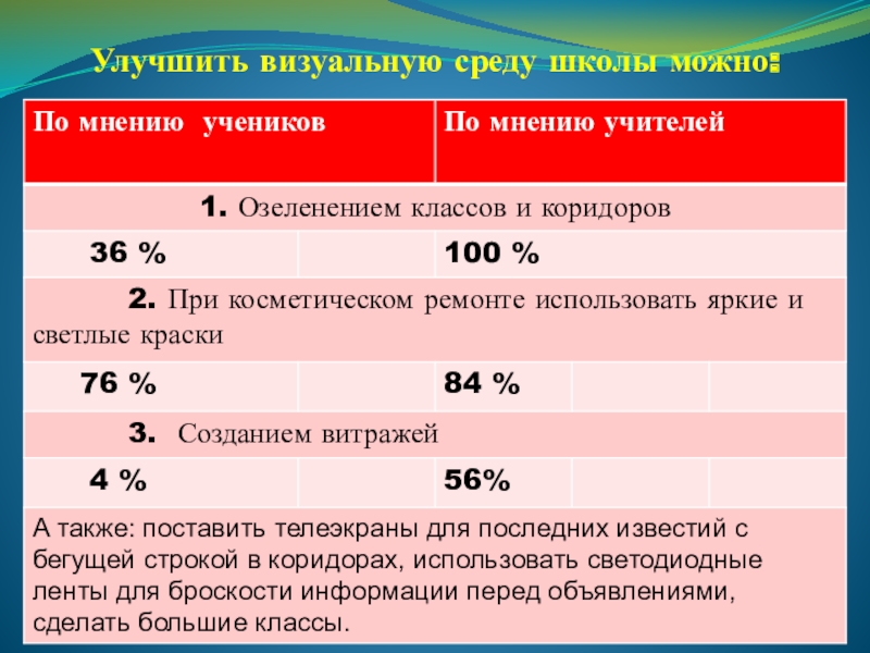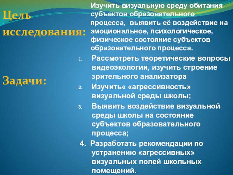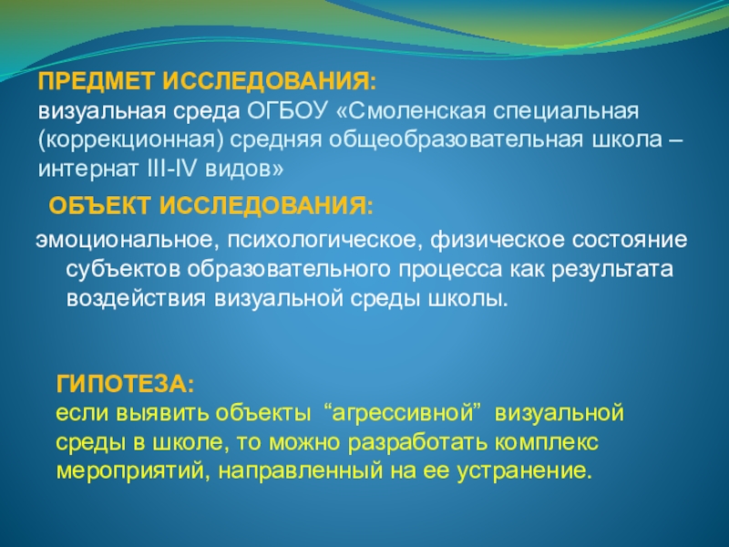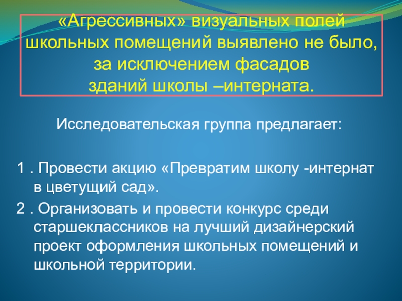 если выявить объекты “агрессивной” визуальной среды в школе, то можно разработать комплекс мероприятий, направленный на ее устранение.