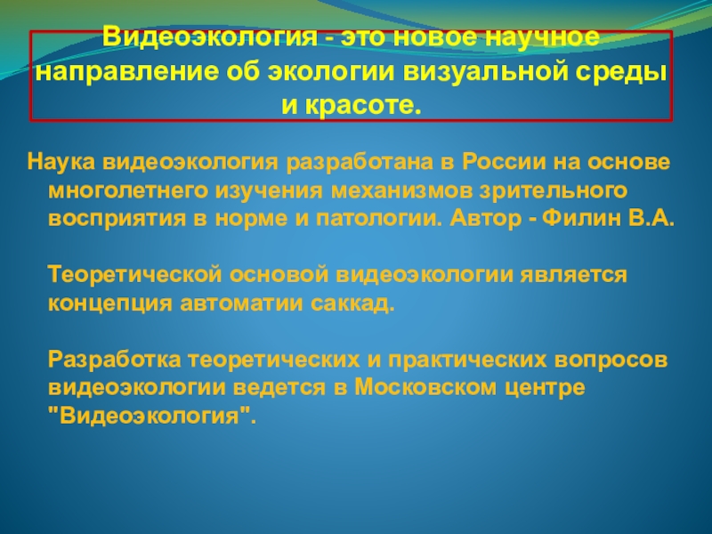 Наука видеоэкология разработана в России на основе многолетнего изучения механизмов зрительного восприятия в норме и патологии. Автор - Филин В.А.