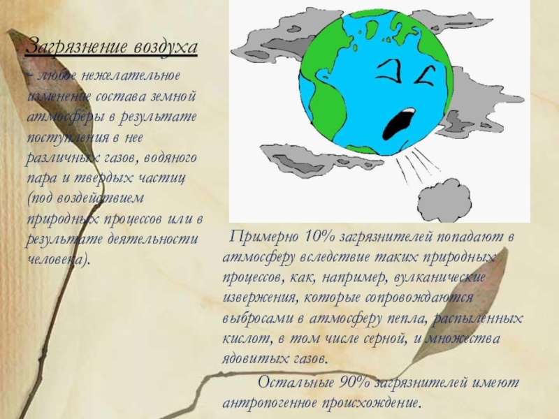 Слайд 5 Загрязнение воздуха - любое нежелательное изменение состава земной