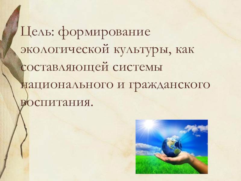 Слайд 3Цель: формирование экологической культуры, как составляющей системы национального и гражданского воспитания.