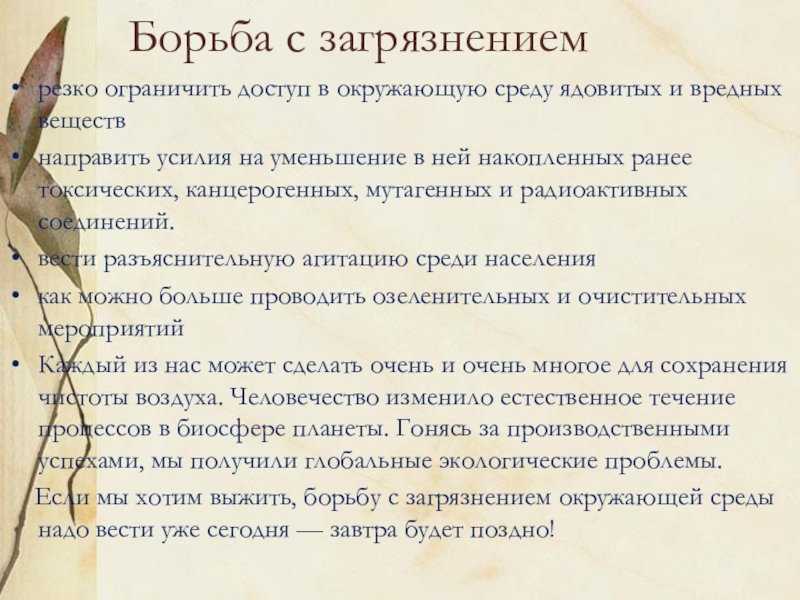 Если мы хотим выжить, борьбу с загрязнением окружающей среды надо вести уже сегодня — завтра будет поздно!