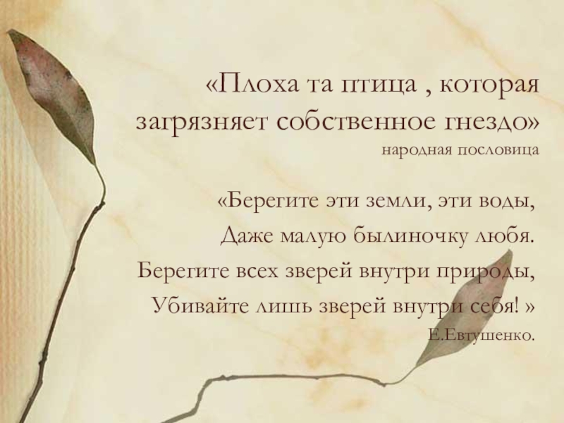 Слайд 2«Плоха та птица , которая загрязняет собственное гнездо»