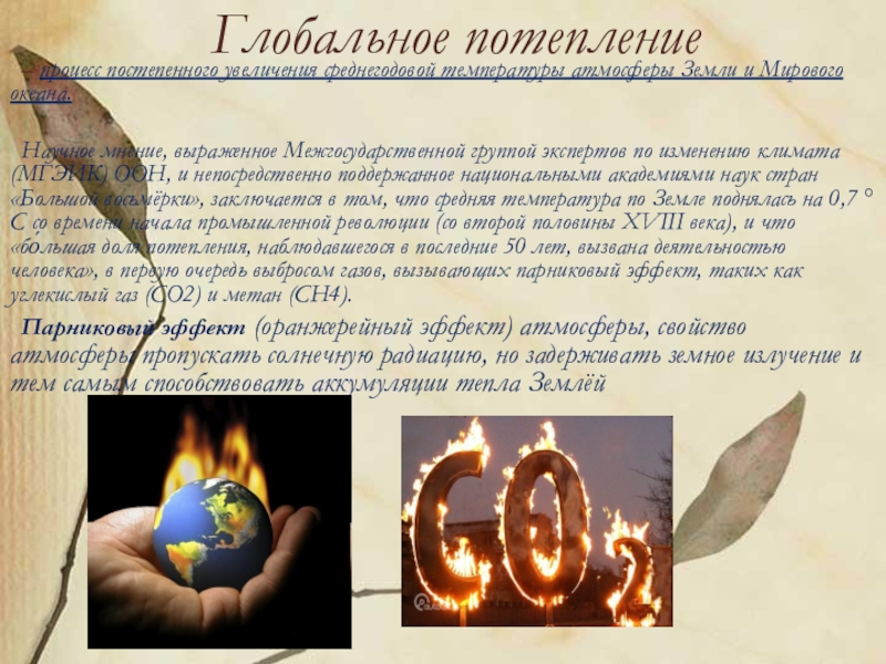 Научное мнение, выраженное Межгосударственной группой экспертов по изменению климата (МГЭИК) ООН, и непосредственно поддержанное национальными академиями наук стран «Большой восьмёрки», заключается в том, что средняя температура по Земле поднялась на 0,7 °C со времени начала промышленной революции (со второй половины XVIII века), и что «бо́льшая доля потепления, наблюдавшегося в последние 50 лет, вызвана деятельностью человека», в первую очередь выбросом газов, вызывающих парниковый эффект, таких как углекислый газ (CO2) и метан (CH4).
