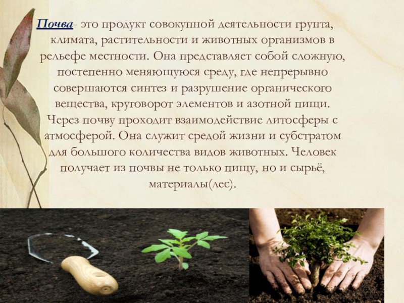 в рельефе местности. Она представляет собой сложную, постепенно меняющуюся среду, где непрерывно совершаются синтез и разрушение органического вещества, круговорот элементов и азотной пищи. Через почву проходит взаимодействие литосферы с атмосферой. Она служит средой жизни и субстратом для большого количества видов животных. Человек получает из почвы не только пищу, но и сырьё, материалы(лес).