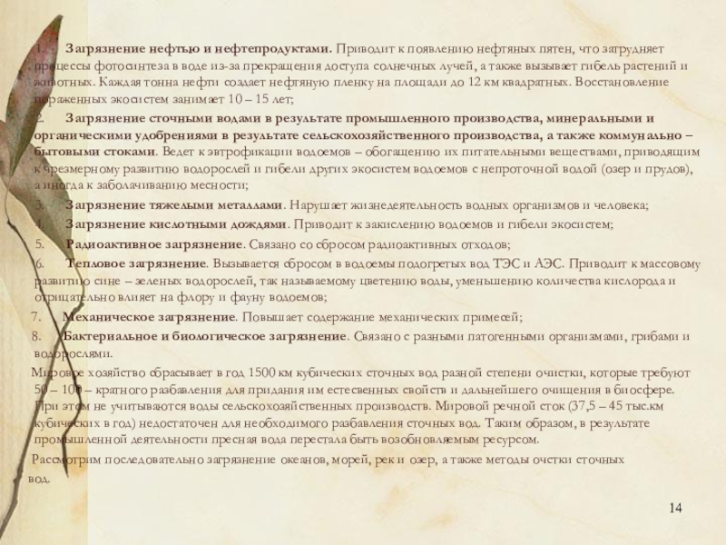 Слайд 14 1. Загрязнение нефтью и нефтепродуктами. Приводит к