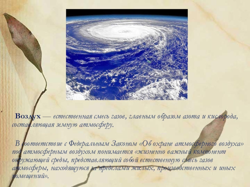 Слайд 4́ Воздух — естественная смесь газов, главным образом азота и кислорода, составляющая земную