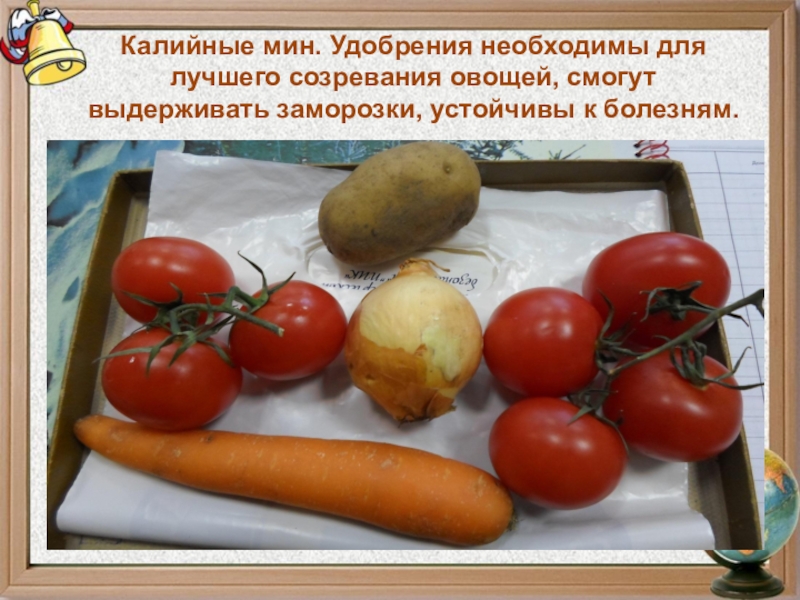 Слайд 16Калийные мин. Удобрения необходимы для лучшего созревания овощей, смогут выдерживать заморозки, устойчивы
