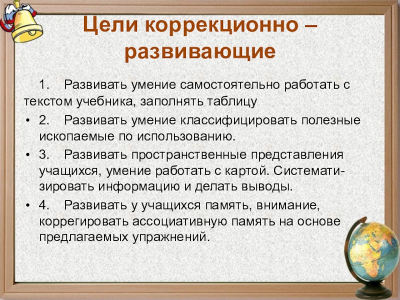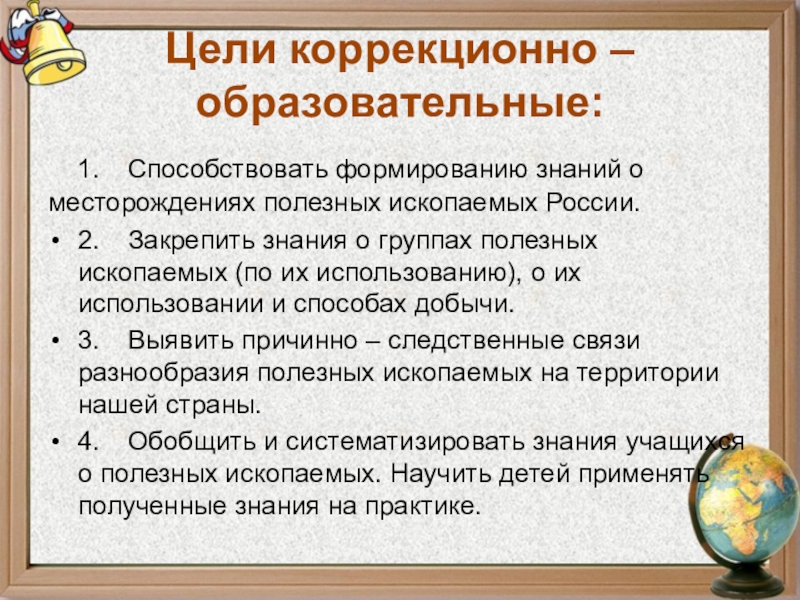 Цели коррекционно – образовательные: 1. Способствовать формированию знаний о месторождениях полезных ископаемых России.2. Закрепить знания о группах полезных ископаемых (по их использованию), о их использовании и способах добычи.3. Выявить причинно – следственные связи разнообразия полезных ископаемых на