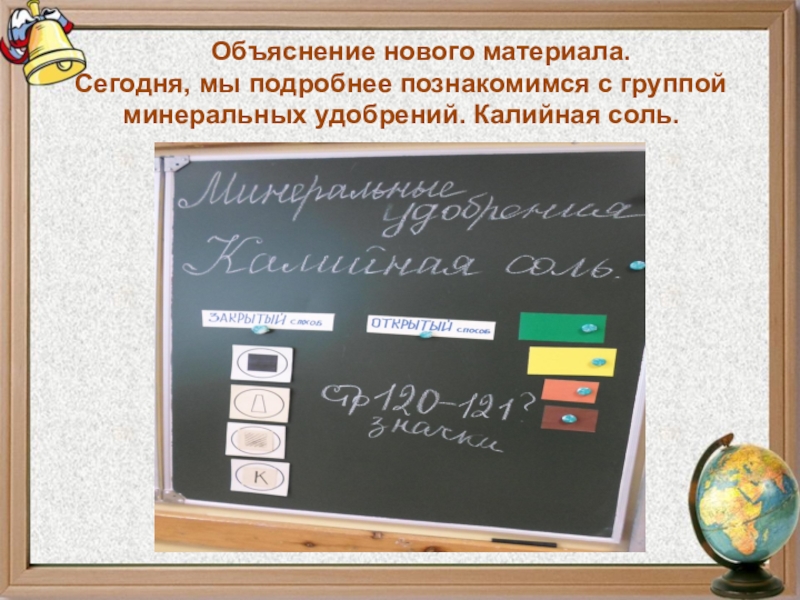 Слайд 15 Объяснение нового материала. Сегодня, мы подробнее познакомимся с группой минеральных удобрений. Калийная