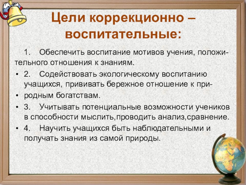 Цели коррекционно – воспитательные:   1.	Обеспечить воспитание мотивов учения, положи-   тельного отношения к знаниям.2.	Содействовать