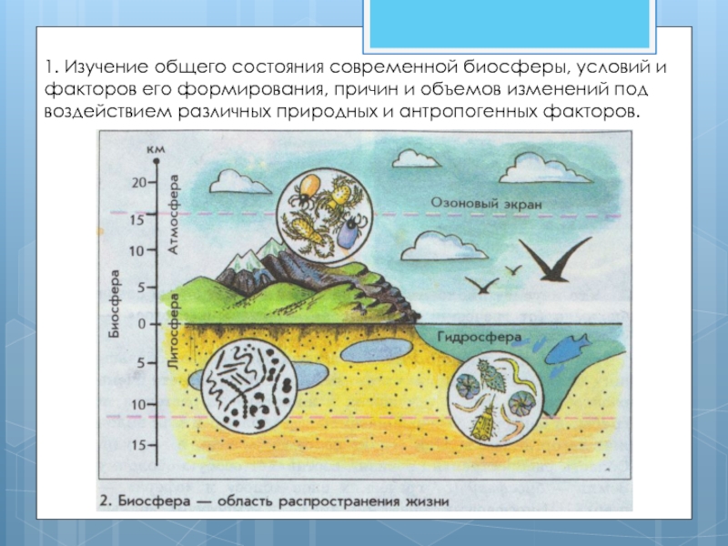 Слайд 31. Изучение общего состояния современной биосферы, условий и факторов его формирования,