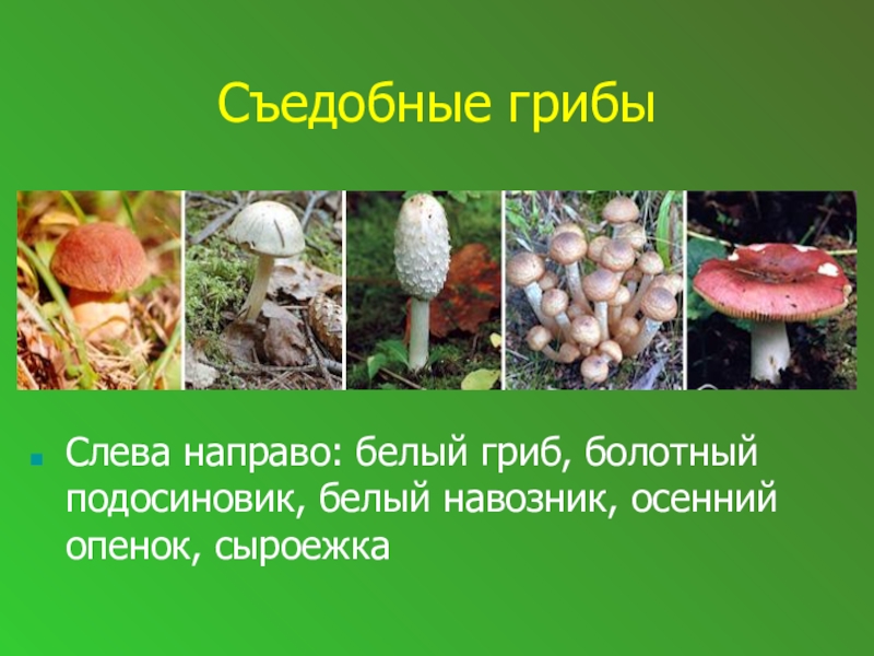 Слева направо: белый гриб, болотный подосиновик, белый навозник, осенний опенок,