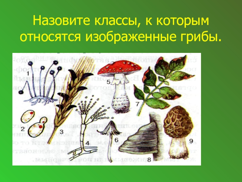 Слайд 16Назовите классы, к которым относятся изображенные грибы.