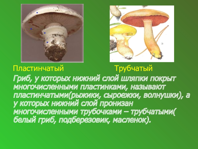 Гриб, у которых нижний слой шляпки покрыт многочисленными пластинками, называют пластинчатыми(рыжики, сыроежки, волнушки), а у которых нижний слой пронизан многочисленными трубочками – трубчатыми( белый гриб, подберезовик, масленок).