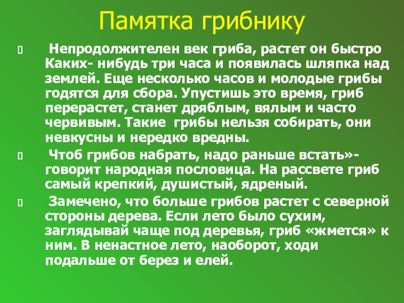 Чтоб грибов набрать, надо раньше встать»- говорит народная пословица. На рассвете гриб самый крепкий, душистый, ядреный.