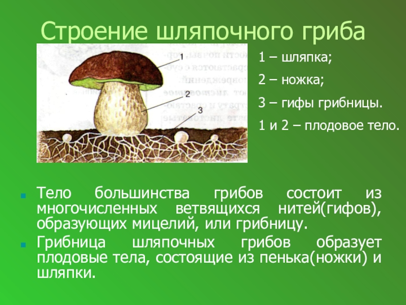 Грибница шляпочных грибов образует плодовые тела, состоящие из пенька(ножки) и шляпки.