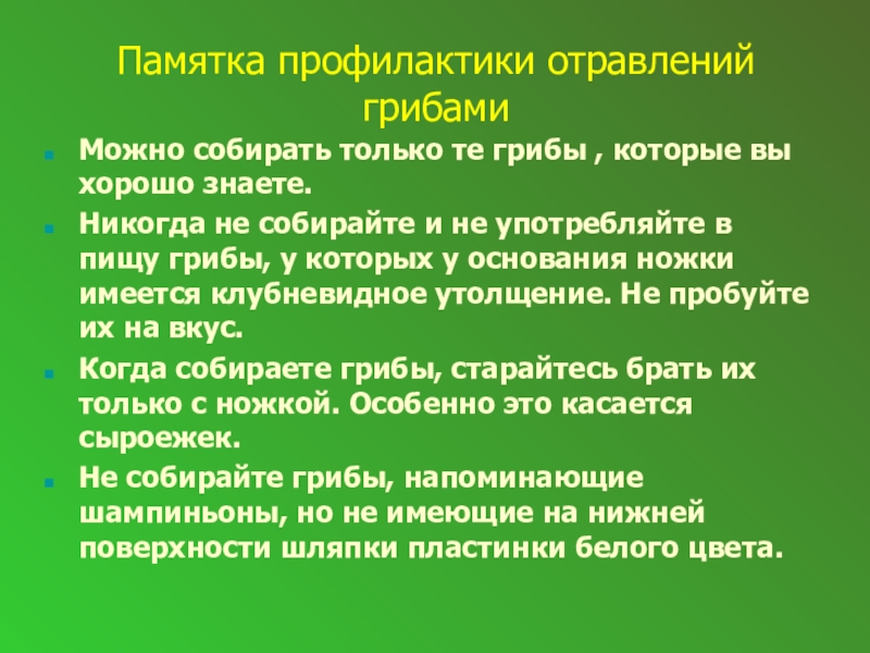 Не собирайте грибы, напоминающие шампиньоны, но не имеющие на нижней поверхности шляпки пластинки белого цвета.