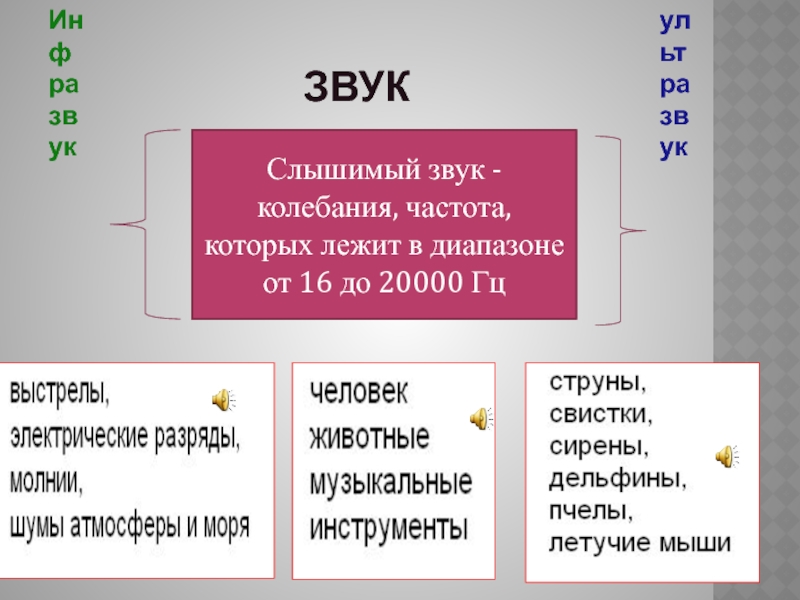 Слышимый звук -колебания, частота, которых лежит в диапазоне