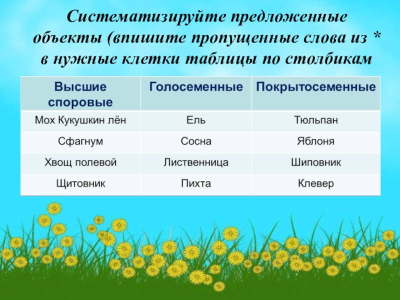* Мох Кукушкин лён, хвощ полевой, сосна, пихта, яблоня, клевер.