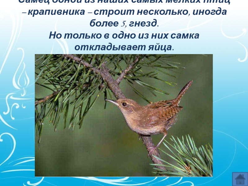 Слайд 13Самец одной из наших самых мелких птиц – крапивника – строит