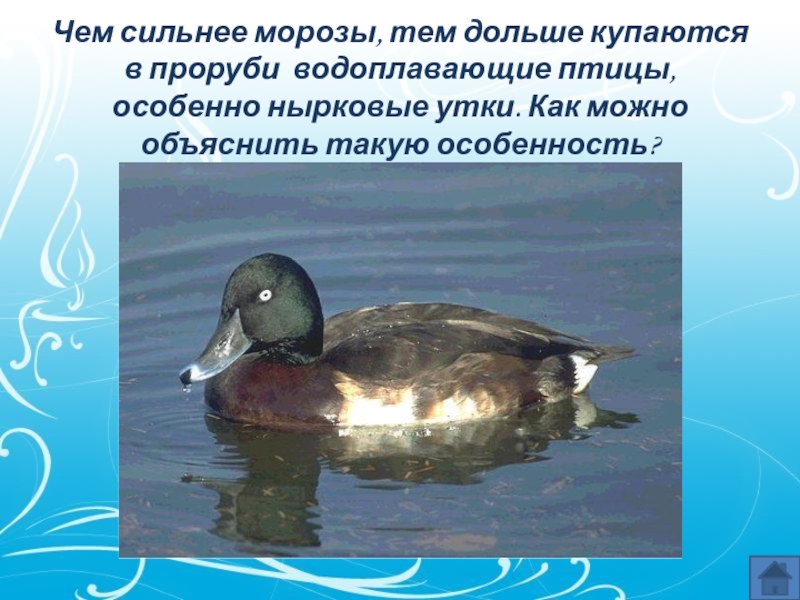 Слайд 12Чем сильнее морозы, тем дольше купаются в проруби водоплавающие птицы, особенно