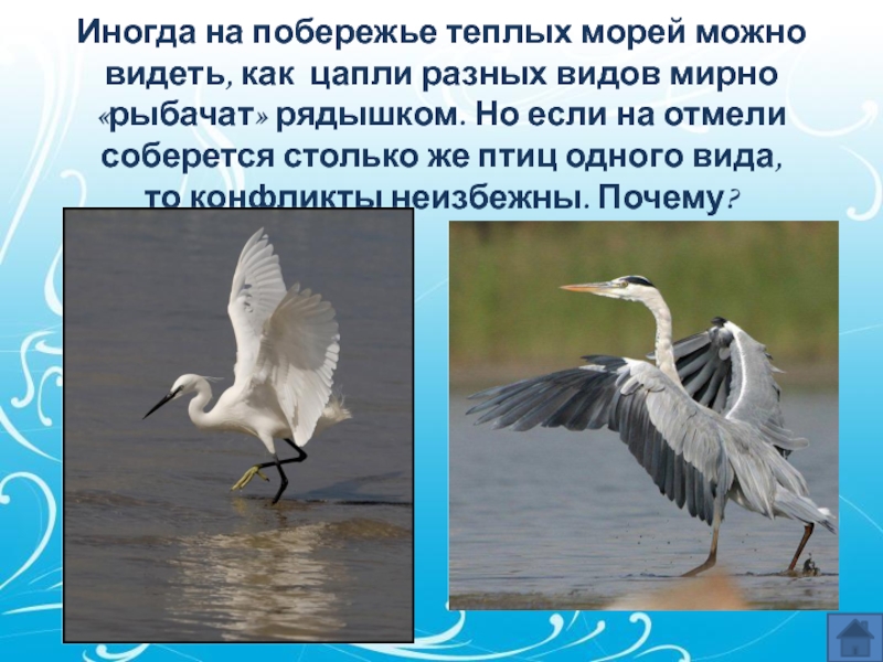 Слайд 14Иногда на побережье теплых морей можно видеть, как цапли разных видов
