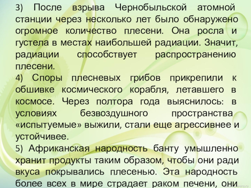 огромное количество плесени. Она росла и густела в местах наибольшей радиации. Значит, радиации способствует распространению плесени.